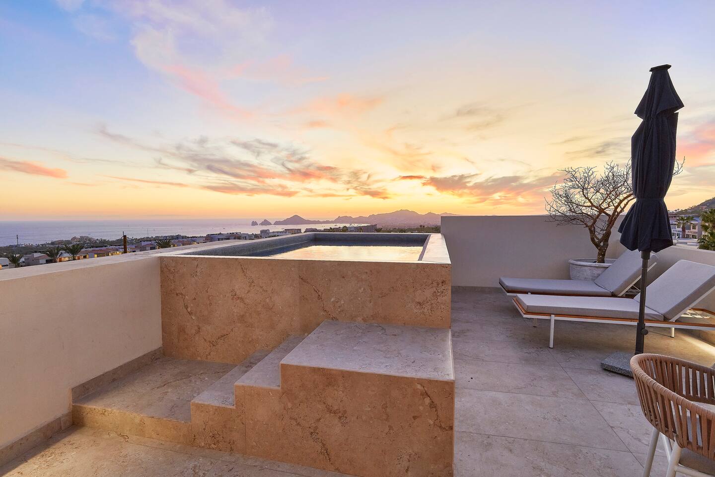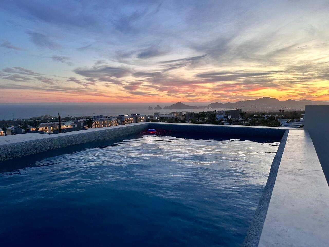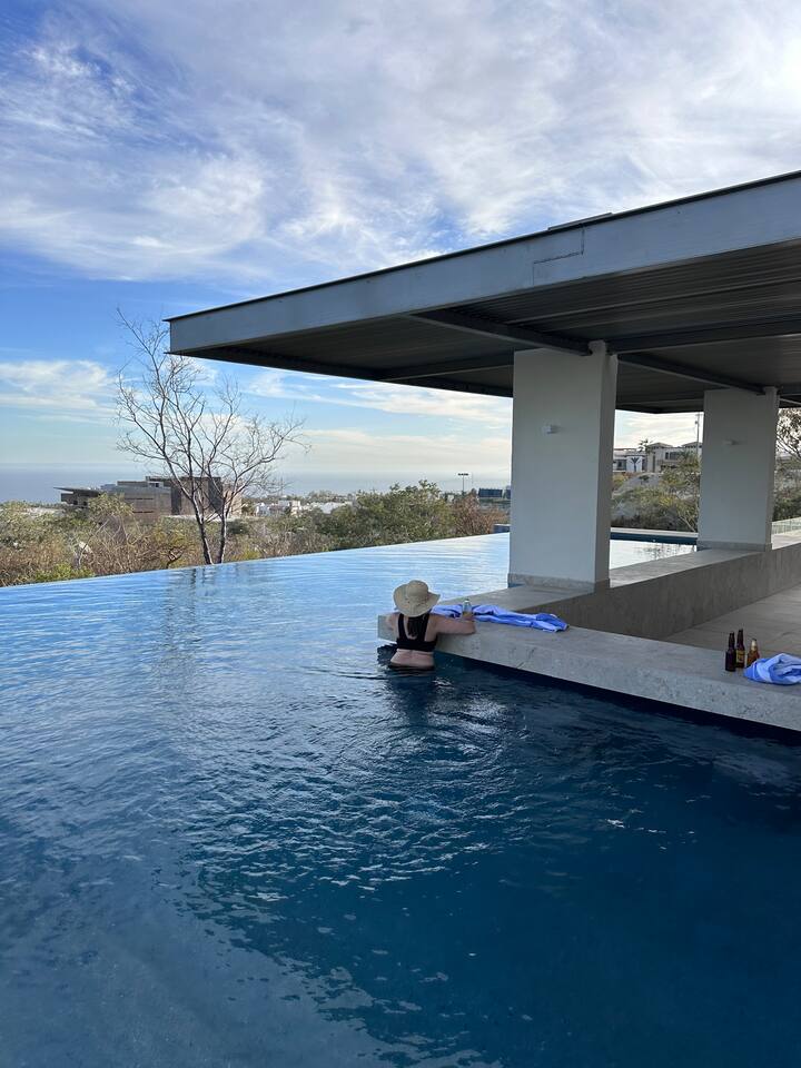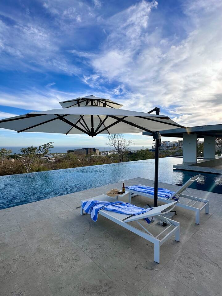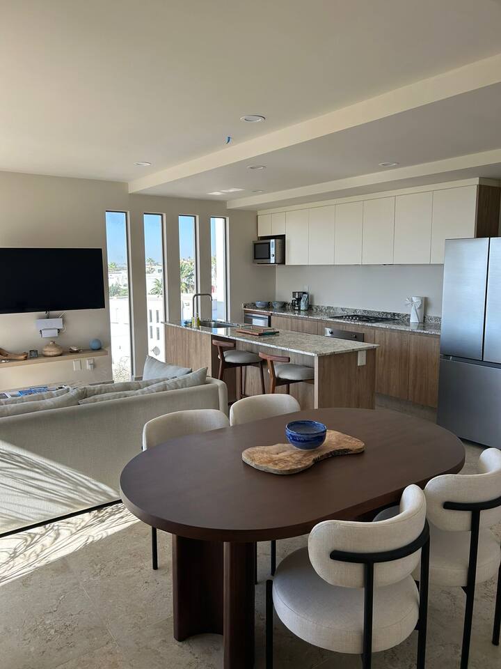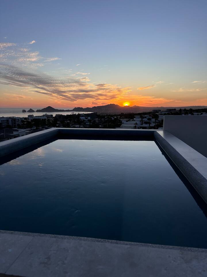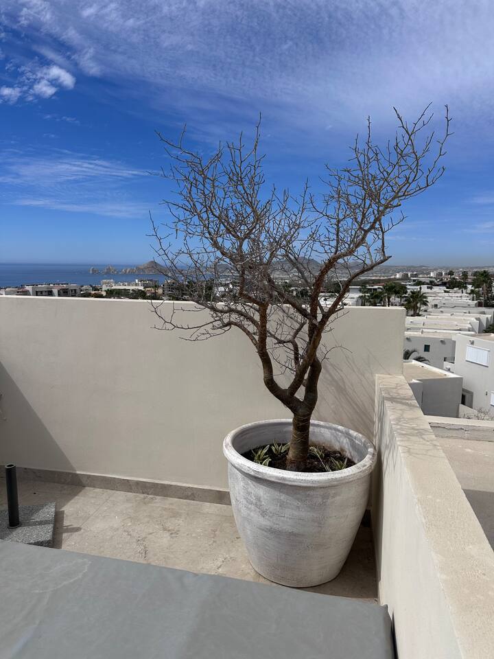Thoughtfully designed as our personal home-away-from-home, this penthouse condo offers the perfect balance of modern luxury and local charm. Nestled in the exclusive El Tezal residential zone, Cabo Costa is perched above the Sea of Cortez and Pacific Ocean, offering breathtaking panoramic views, upscale amenities, and convenient access to everything Cabo has to offer. What Makes Cabo Costa Unique • Stunning Location: Overlooking the Sea of Cortez and Pacific Ocean, the property is perfectly positioned to capture Cabo’s world-famous sunsets. Just 7 minutes from downtown Cabo San Lucas, the Marina, and Beaches, you’ll enjoy a private retreat that’s close to the action. • Modern Mexican Design: Inspired by the desert’s vibrant colors and designed to harmonize with the local environment, Cabo Costa combines contemporary architecture with natural elegance. Close to Key Attractions • Downtown Cabo San Lucas: 7 minutes. • Hike Cerro de Las Antenas: @ Main Gate, up 1.6 miles to the top and unlimited hiking all around the mountains behind the condo. • The Marina: 10 minutes. • San José del Cabo: 29 minutes. • Beach Access (Our two favorite, Playa Santa Maria & Playa el Chileno): <10 minutes. • Shopping (Costco, Walmart, Fresko, Home Depot): 3–7 minutes. What You’ll Love • Unparalleled Views: Bask in sweeping, unobstructed vistas from the 4th-floor living and kitchen areas, the expansive wrap-around balcony, or your private 5th-floor rooftop terrace, offering breathtaking panoramas to the South, West, and North. • Premium Comfort: From plush bedding to designer furniture, every detail has been curated for your ultimate relaxation. • Exclusive Features: A private rooftop splash pool, fully equipped chef’s kitchen, and drinkable filtered, conditioned (yes, we have our own water softener, UV light treatment, very unusual in MX) water throughout ensure a luxury experience. Bedrooms & Bathrooms • Master Suite: Indulge in a King bed with premium linens, a spa-inspired en-suite bathroom, bathrobes, and a walk-in closet with a secure safe. • Guest Bedroom: A cozy Queen bed with plush bedding, ample storage, and easy access to spa-inspired full en-suite bathroom. • Bathrooms: Two luxurious full bathrooms with walk-in showers, polished granite countertops, and a convenient half-bath. • Laundry: Full-size LG stackable washer and dryer paired with a tankless water heater for endless hot water. Living & Dining Areas • Open-Concept Design: A stylish living room seamlessly flows into the dining and kitchen areas, framed by floor-to-ceiling windows showcasing stunning Cabo views. • Dining Options: Choose between a sleek table for four or casual seating with one modern stool at the granite kitchen island. • Added Touches: Air conditioning, lush live plants, and two (living/kitchen & penthouse) 55” Smart TVs with Starlink Wi-Fi for ultra-fast, reliable internet no matter where you are are in our unit. Chef’s Kitchen Equipped for everything from quick breakfasts to gourmet feasts, this kitchen has it all: • SMEG 5-burner gas stovetop and wall oven. • Panasonic 4-in-1 microwave, air fryer, broiler, and convection oven. • Samsung refrigerator with built-in beverage center and advanced water filtration. • Samsung dishwasher with three racks and whisper-quiet operation. • Blackstone 22” outdoor grill on the Penthouse level for al fresco dining. • Comprehensive water filtration/UV and softener system for safe, high-quality water. Penthouse Rooftop Features Your private rooftop terrace is the crown jewel of this property: • Private splash pool with built-in bench seating overlooking Land’s End and El Arco Arch of Cabo San Lucas. • A bar/bench area with four comfortable chairs, a mini-fridge/freezer, Breville Air fryer/toaster oven and a sink. • Dining table for six and two lounge chairs beneath LED-lit 10-ft umbrellas. • Lush greenery featuring Torote and Plumeria trees for a touch of tropical beauty. • Perfect for sunrise coffees, sunset cocktails, or stargazing under the clear Cabo skies. Transportation Options: • Reserved covered parking space included for your own rental. • Convenient airport transfers with our trusted driver in a Suburban for <$100 USD each way. • Easy access to Uber for exploring the greater Cabo area without having to rent your own car. Cabo Costa Community Amenities • Concierge service and 24-hour security for peace of mind. • Community Infinity pool and a kids’ splash pool with wide ocean views. • State-of-the-art gym and wellness center. • Co-working space for productivity and relaxation. • Fire pit Covered Seating area by pool for social gatherings Why Stay Here? This penthouse isn’t just a place to stay—it’s a lifestyle. Whether you’re here for Cabo’s vibrant nightlife, serene beaches, or thrilling outdoor adventures, this luxurious condo offers the perfect home base. From the unmatched views to the modern Mexican design and exceptional amenities, every moment here is unforgettable. Book Your Stay Today! Don’t miss out on this one-of-a-kind property. Reserve now to experience the pinnacle of luxury, style, and breathtaking views in Cabo Costa! 🌟 5 Amazing Day Trips🌟 Discover the incredible variety of adventures you can enjoy just a short drive! From beaches to art, golf, and more, these day trips offer something for everyone staying at The Best Cabo Penthouse. 1️⃣ Sunday Brunch in Todos Santos Take a scenic, 1-hour drive to this charming colonial town. Stroll cobbled streets, explore art galleries, enjoy farm-to-table dining, and unwind on stunning beaches. 2️⃣ Relax at Playa Santa Maria Only 11 minutes from Cabo, this beautiful beach is perfect for swimming, snorkeling, or simply relaxing. Pack a picnic and cap the day with tacos at La Lupita. 3️⃣ Art Walk in San Jose del Cabo Visit on a Thursday evening for the vibrant Art Walk. Explore galleries, enjoy wine tastin